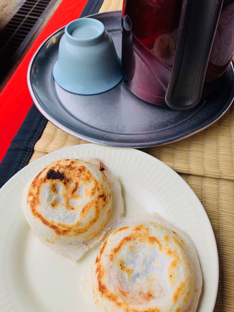 道真公が亡くなった際、その餅を梅の枝に刺して供えたことから「梅ヶ枝餅」という名前になったそうです。梅の実は入っていないので、初めて食べる人はちょっとびっくりするかもしれません。
